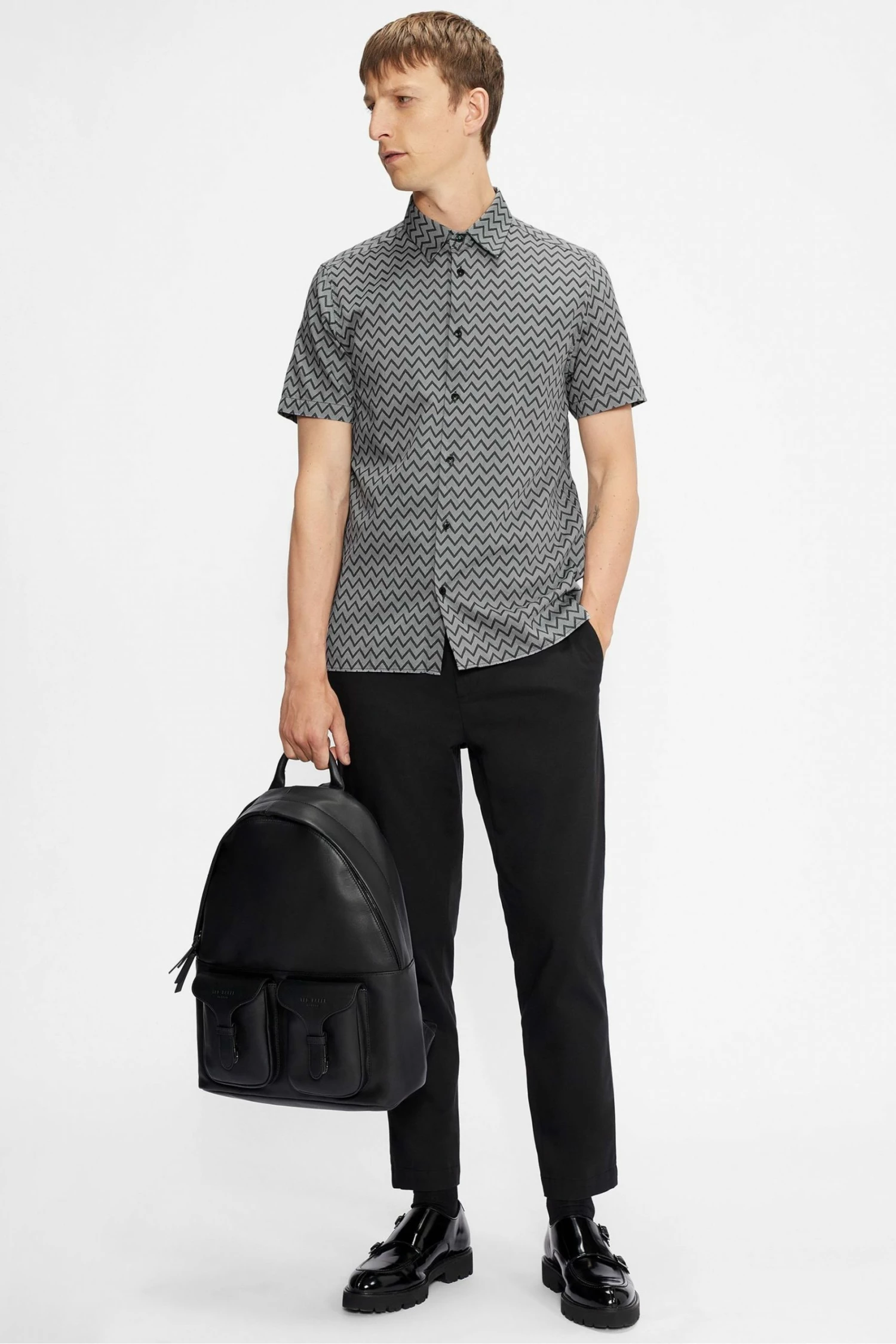 Want to zig where others zag? The BORDUP shirt is for you. A classic shirt shape in a stylish jacquard weave fabric with a striking zigzag print. Team with tailored trousers and black leather accessories for a look perfect for individuals who like to make an impact.