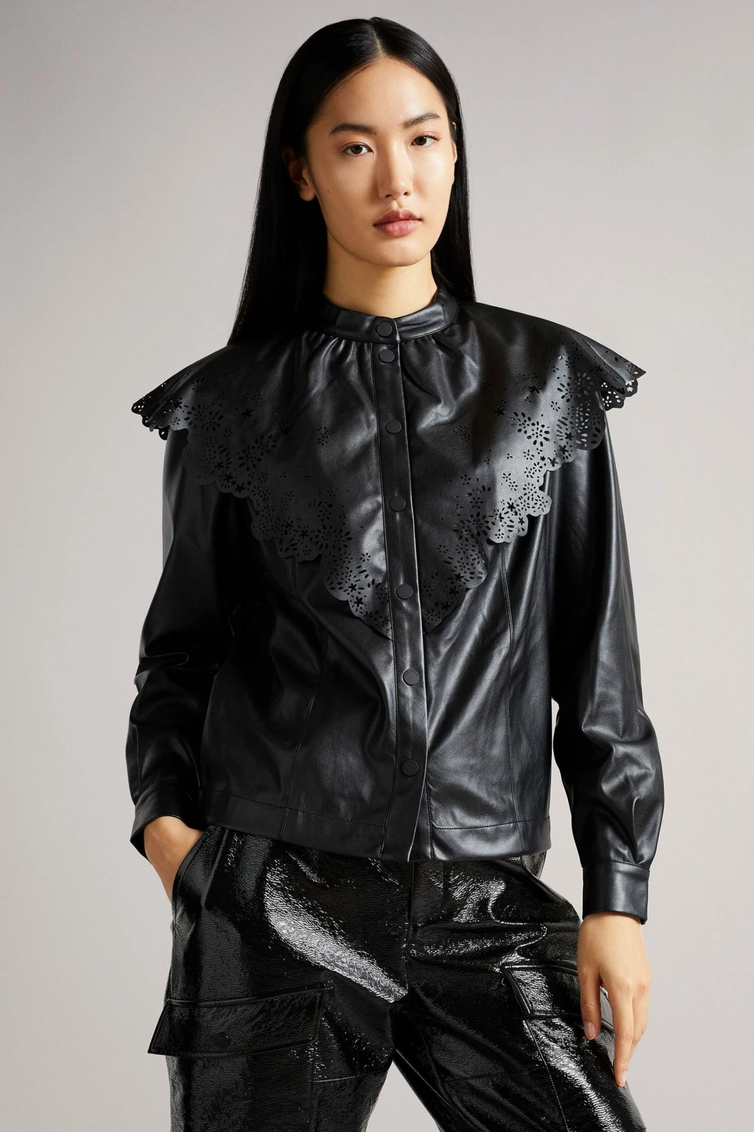 MAISSON it s why the lady is a vamp. Bringing a twist to classic English lace, this pleather top is certain to add a statement to your wardrobe. A button-up t-shirt design, the leather biker look contrasts with the perforated lace-style design of the collar to provide an elegant softness with edge. Pair with pleather trousers for a rock star look or tone down with three-quarter jeans.