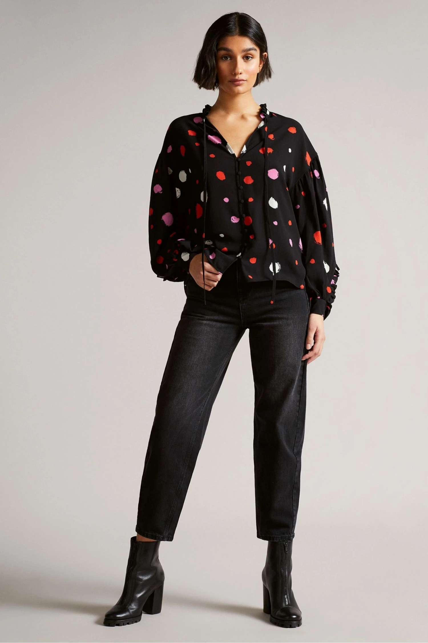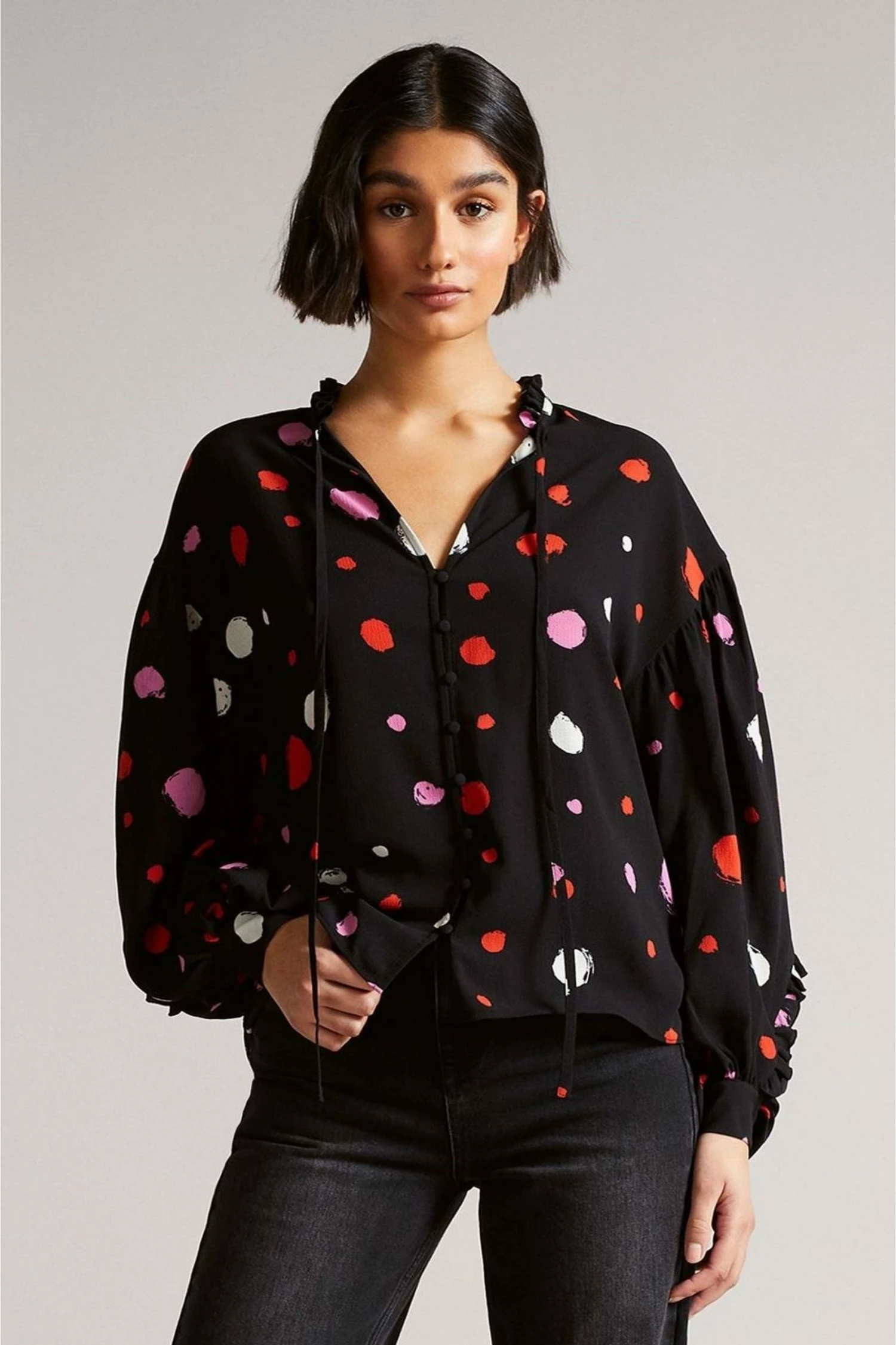 Enhance your workwear wardrobe with this Sunrai blouse from Ted Baker. In a relaxed style with frilled details, front button fastenings, balloon sleeves and signature branding.