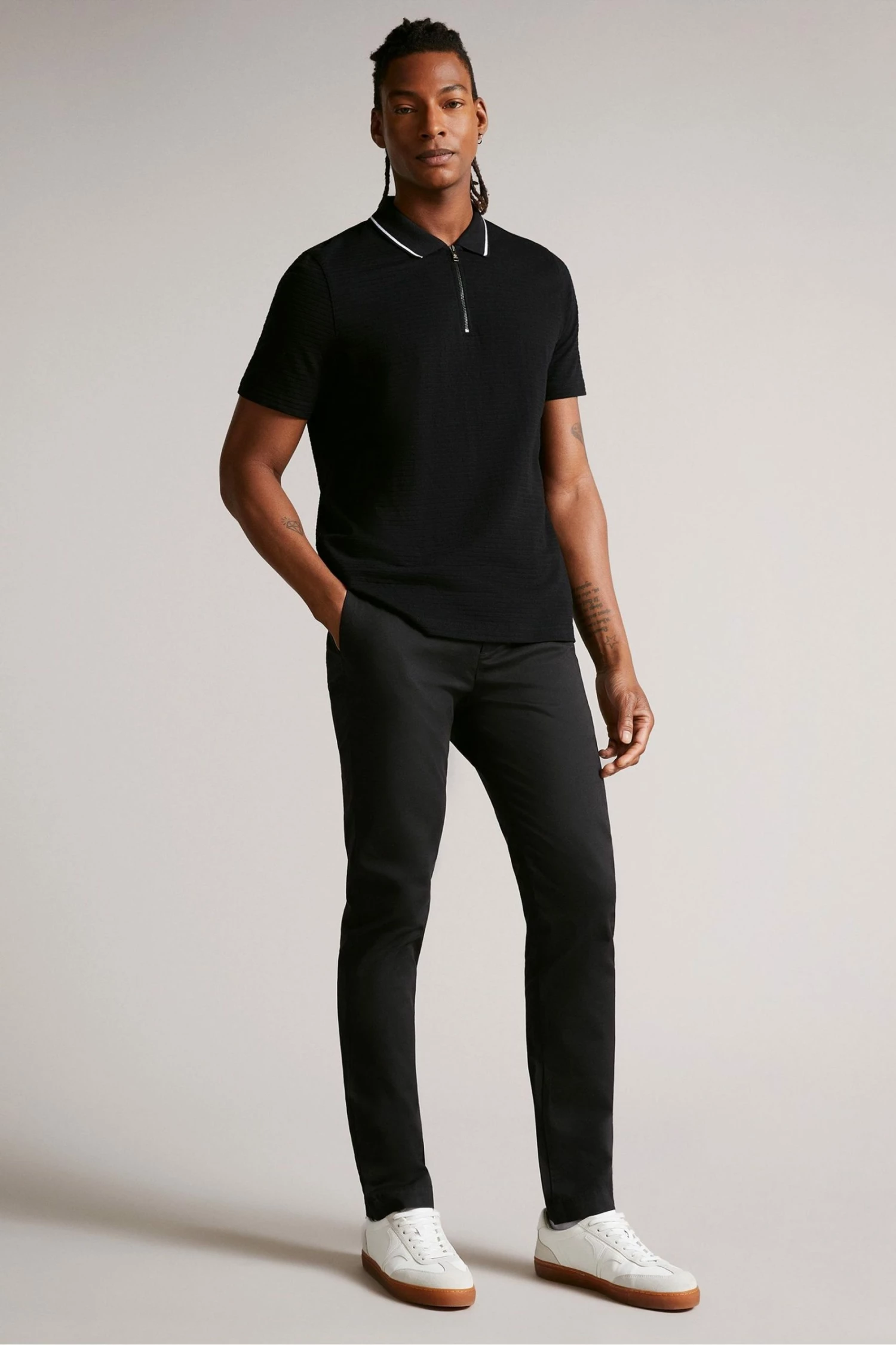 Update your everyday wardrobe with this Buer polo shirt from Ted Baker. In a stylish black colourway with textured fabric, half zip fastening, white trim details and Ted Baker branding.