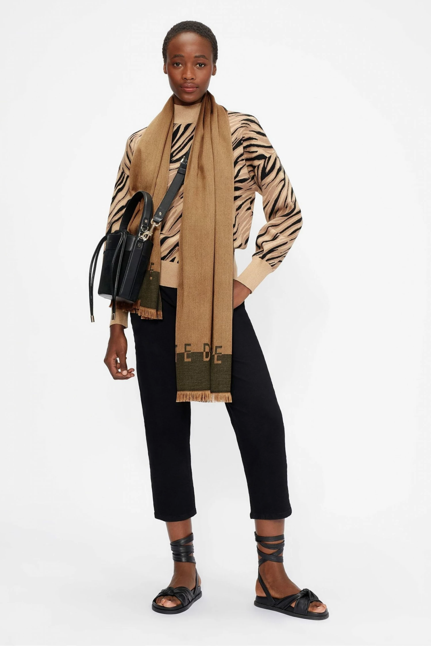 Complete any outfit with a touch of elegance with the ESTELI scarf. Withts woven logo and fringed edge will see you through for seasons to come. Timeless, understated, classic.