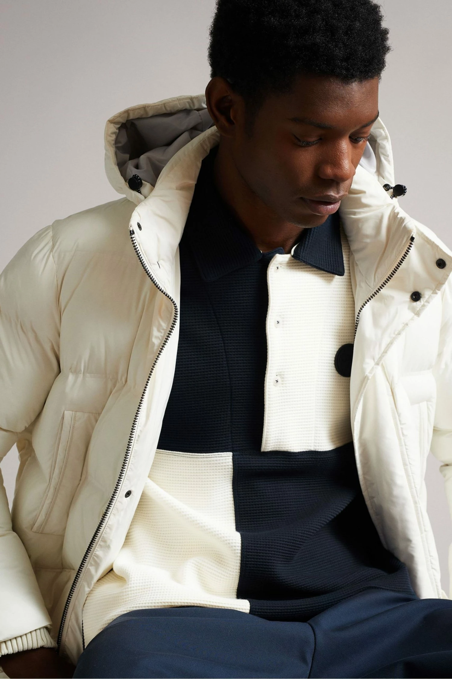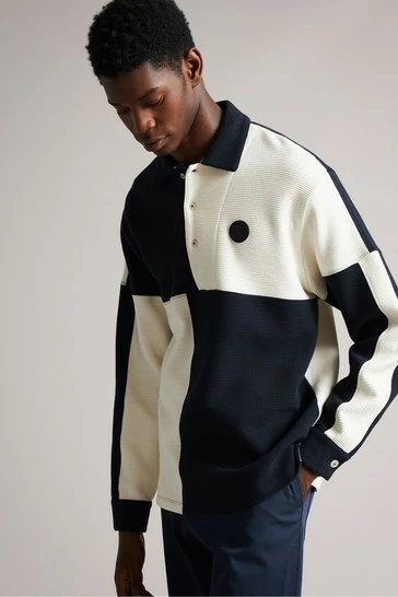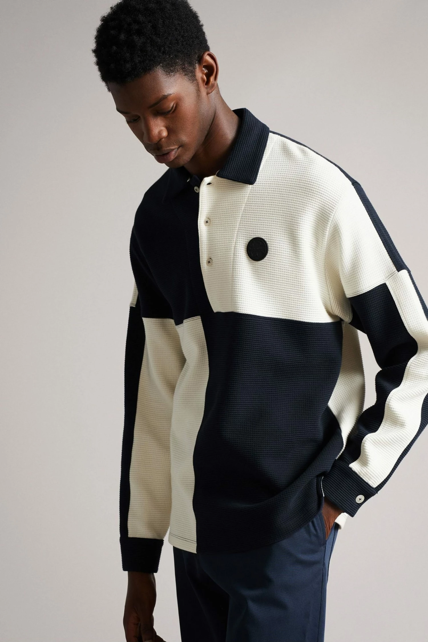 Double up on style. The WICKAM polo shirt has been made from textured cotton, panelled in a two-tone pattern. Designed with a button collar, it s finished with buttoned cuffs and a logo patch at the chest.